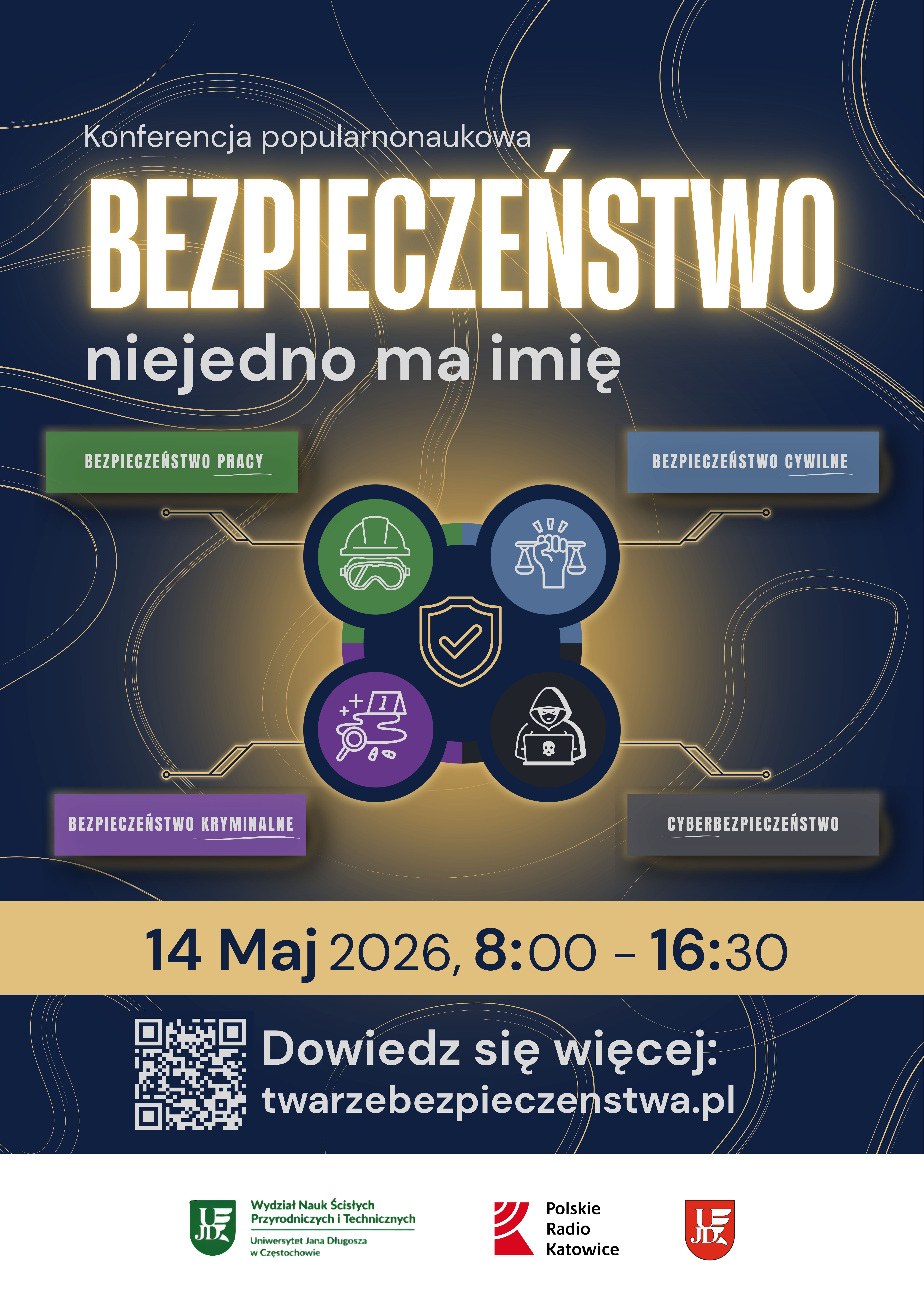 Serdecznie zapraszamy na konferencję popularnonaukową „Bezpieczeństwo niejedno ma imię", która odbędzie się 14 maja 2025 roku w godz. 9:00–16:30 w murach Uniwersytetu Jana Długosza w Częstochowie przy ul. Armii Krajowej 13/15.