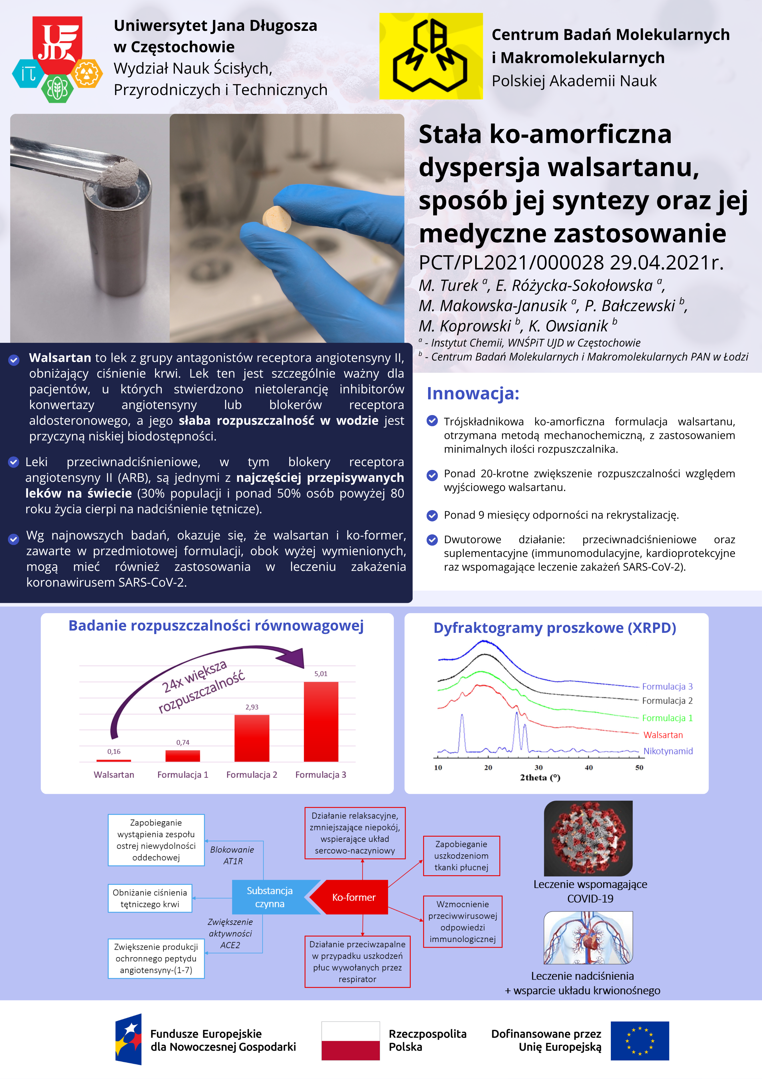 Marika Turek, Ewa Różycka-Sokołowska, Małgorzata Makowska-Janusik, Piotr Bałczewski, Krzysztof Owsianik, Marek Koprowski „Stała ko-amorficzna dyspersja walsartanu, sposób jej syntezy oraz jej medyczne zastosowanie” - plakat